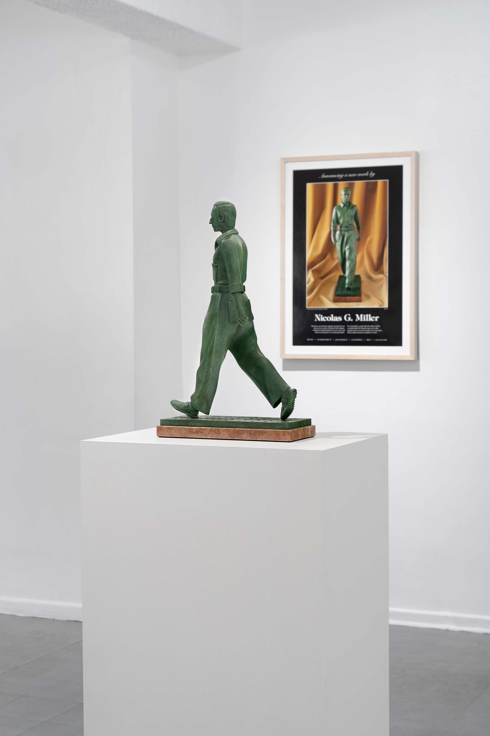 Yet sculptures do not float; they are embedded in space. Printed, cast, and patinated, this data file is more than a sculpture — or even several. Miller’s Everett Sloane in Yohji Yamamoto S/S 2000 (2021) is a program realized via the sculpture’s design, production, circulation, and display. This is the secret power of the statuette. Though small, it automatically transforms its surroundings into its own furniture, not unlike a grand monument in a city square, or the marvelous jewel of an ornate necklace. Living room and gallery alike become its setting. As a digital file, the sculpture is beyond both context and scale; as an intimately-sized statuette, it transforms its setting, and even its viewers, into its own immaterial substance.